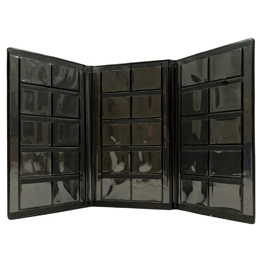 Black collectible token holder with multiple token sleeves on a white background