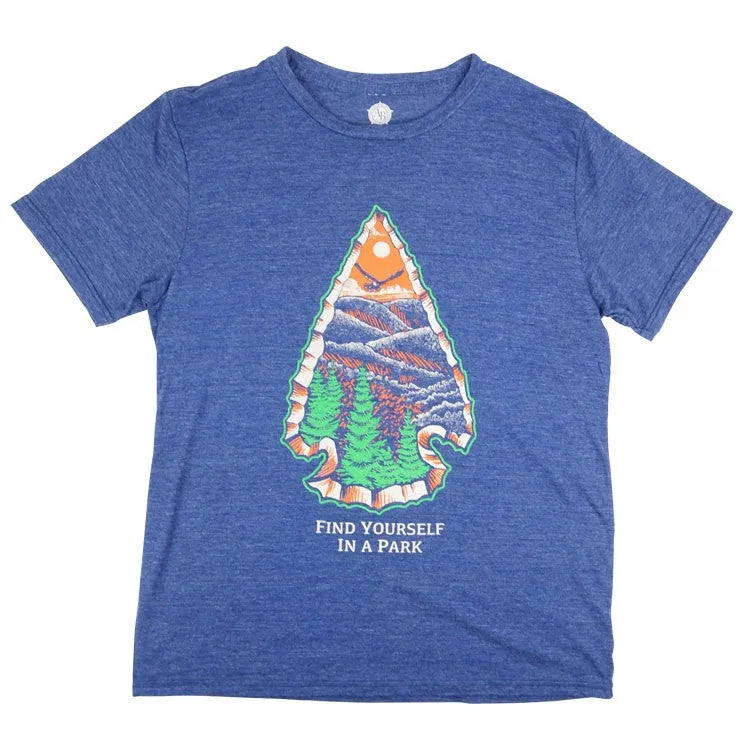 Show the world your love for national parks by sporting our Find Yourself in a Park t-shirt! This classic printed t-shirt features a national park inspired arrowhead image on REPREVE fabric, which is made in part from recycled plastic bottles, so it’s eco-friendly as well as super comfortable.