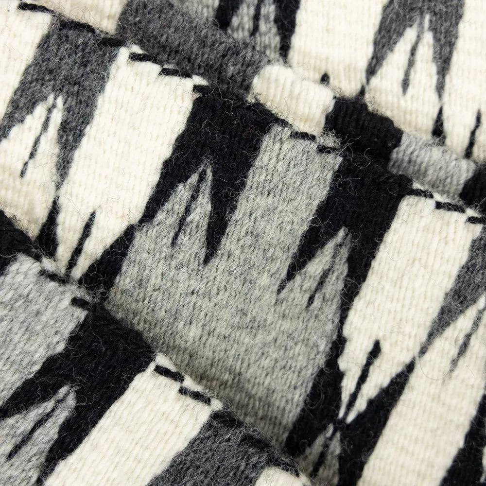 Extreme close-up of a Navajo textile with black, gray, and white pattern