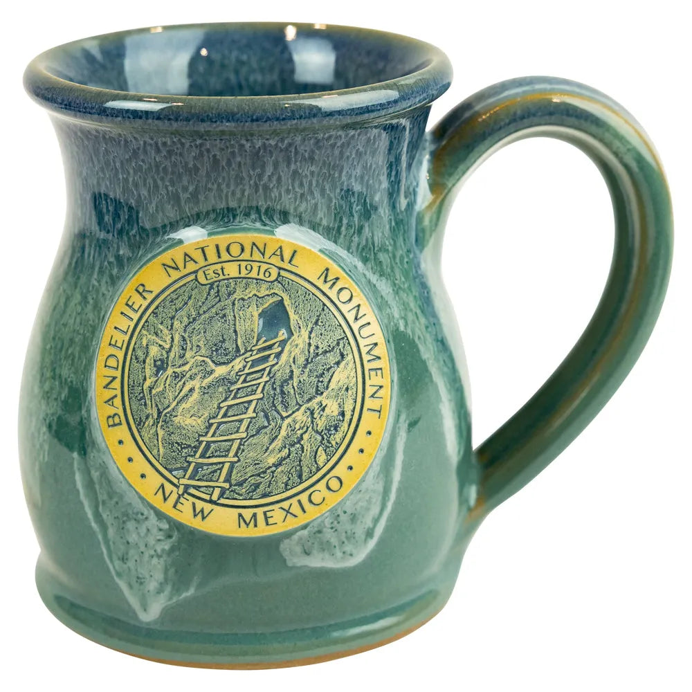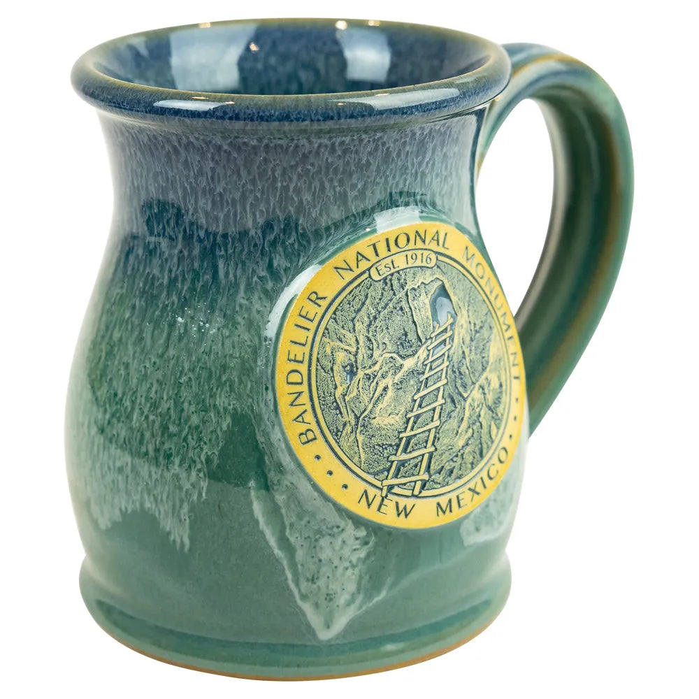 This tall belly design features a rich green glaze with a detailed medallion of Bandelier’s cliff dwellings. The artwork has a design of a wooden ladder leading up to a cavate, a type of cliff dwelling created by the ancestral Puebloans. The mug reflects the history preserved at this New Mexico site, which continues to be an Indigenous cultural heritage site today.