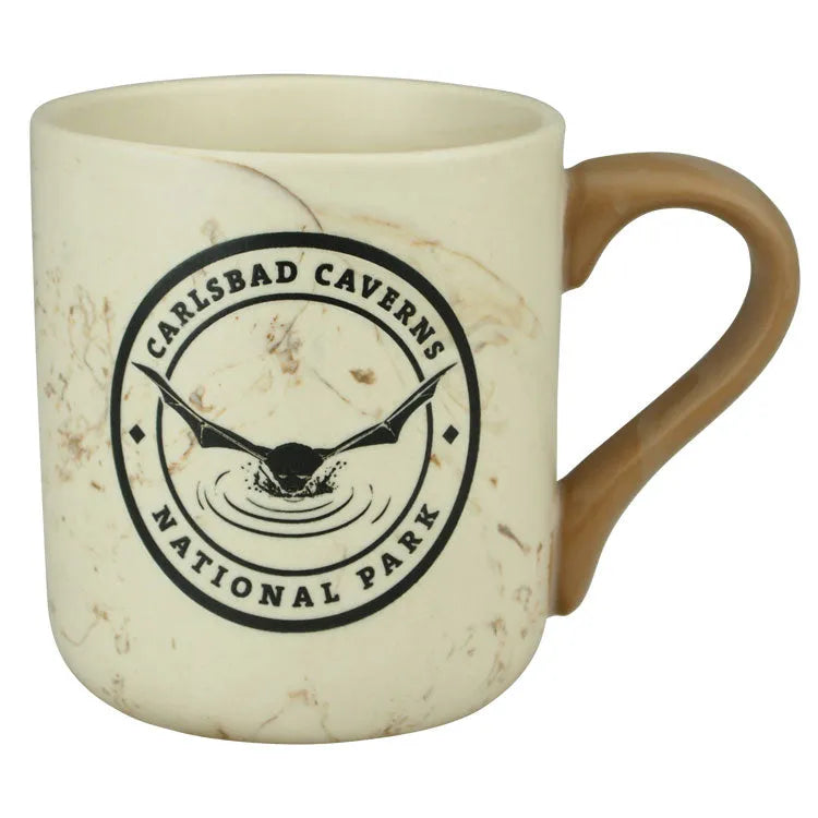 Toast your public lands with this custom marbled ceramic national park mug representing Carlsbad Caverns National Park! One side features WNPA's exclusive round logo depicting a Brazilian free-tailed bat, the most prominent of many bats that make a home in Carlsbad Caverns, grabbing a sip of water during its nighttime flight. The other side offers a quick fun-fact about the park.