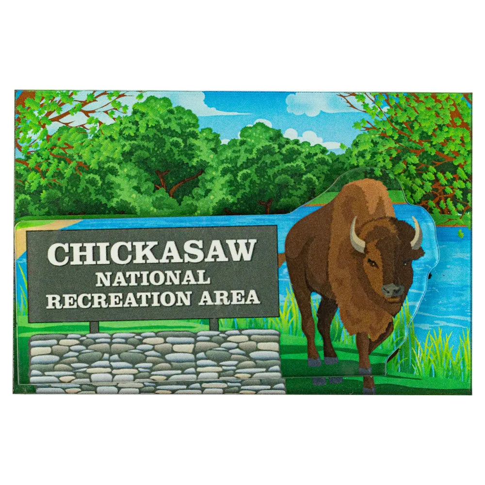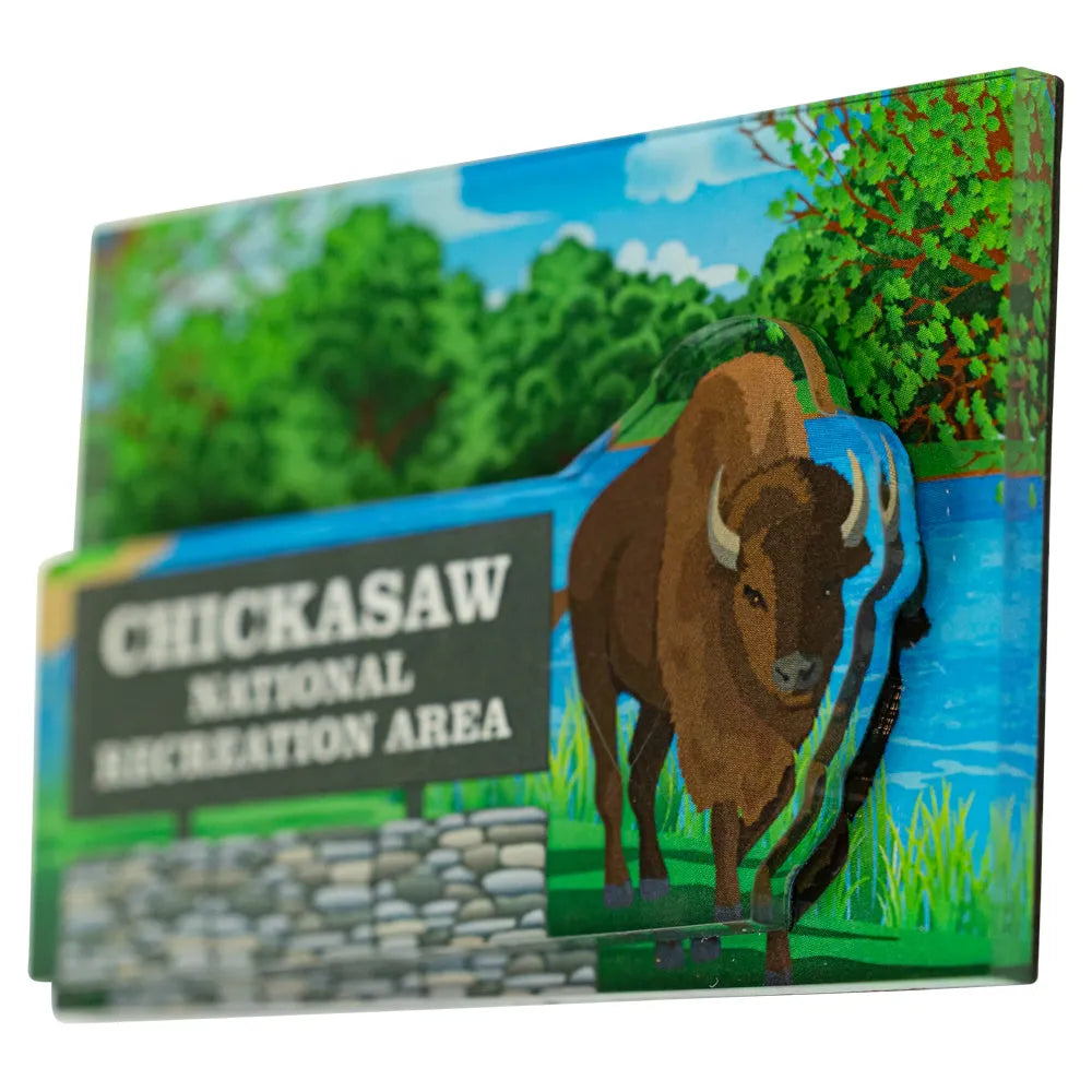 Magnet with a bison and 'Chickasaw National Recreation Area' sign on a natural background
