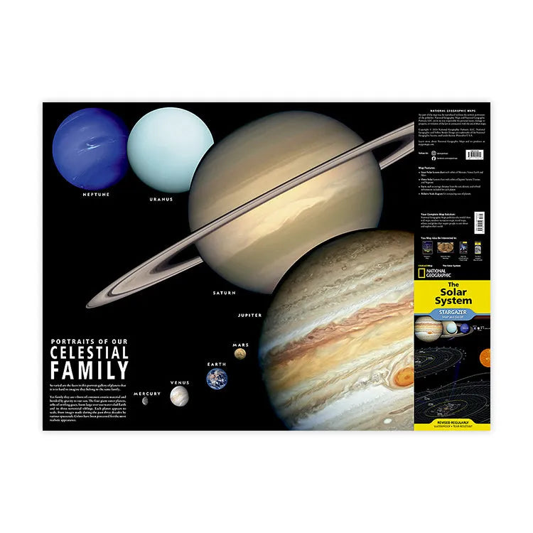 The Solar System Stargazer Map and Guide includes detailed images of the planets and a striking comparison of all of the planets relative to the much larger Sun. A map of the planets shows their progression as they orbit around the Sun from Mercury's 88 days to Neptune's 165 years.