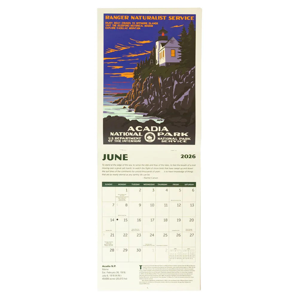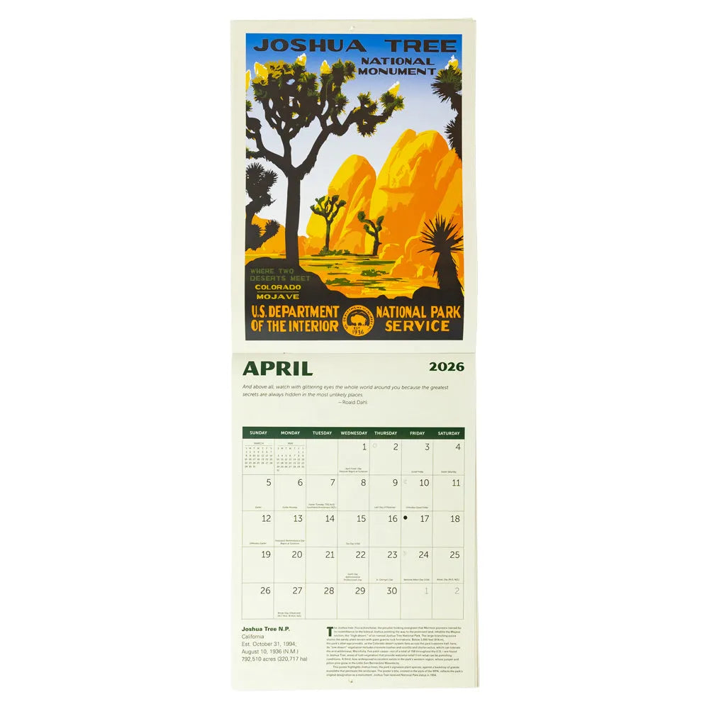 2026 National Parks calendar with WPA poster art on a white background
