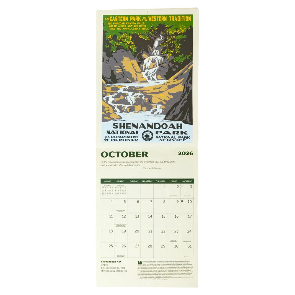 In addition, the 2026 WPA National Parks Wall Calendar is printed on high-quality paper with plenty of space for notes. Mark birthdays, plan camping trips, or count down to your next adventure.