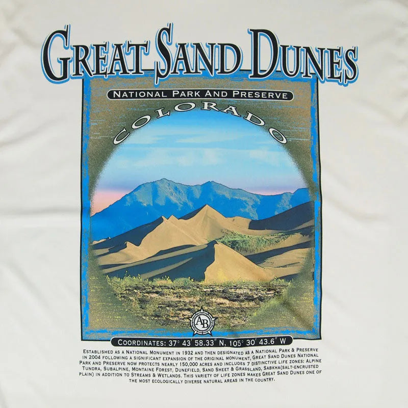This shirt features a Great Sand Dunes logo on the left chest. The back features full color image of North America’s tallest dunes and the surrounding mountains, as well as park coordinates and several fascinating fun-facts about the park itself.