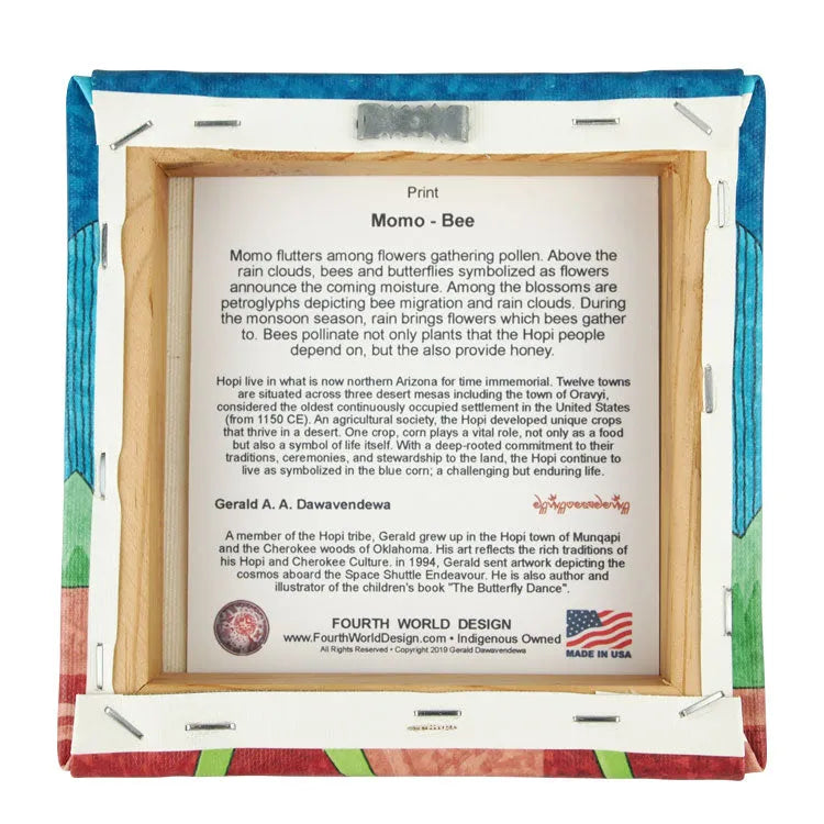 This print title Momo - Bee features an image of Momo fluttering among flowers gathering pollen. Above the rain clouds, bees and butterflies symbolized as flowers announce the coming moisture. Among the blossoms are petroglyphs depicting bee migration and rain clouds. During the monsoon season, rain brings flowers to which bees gather. Bees pollinate not only plants that the Hopi people depend on, but they also provide honey.