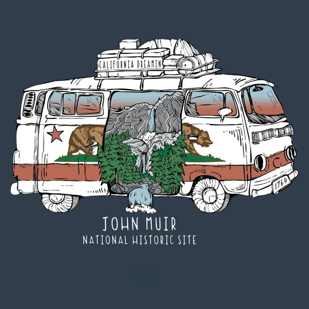 Remember America’s most famous naturalist and conservationist with the John Muir National Historic Site t-shirt. The design features a retro van with the words “California Dreamin’” on the roof, packed with adventure gear. The van is decorated with California icons, including the state bear, and within its side panel is an illustration of waterfalls, granite cliffs, and pine trees. Designed by Wild Tribute, this graphic blends Muir’s love of wild places with the freedom of road trips.