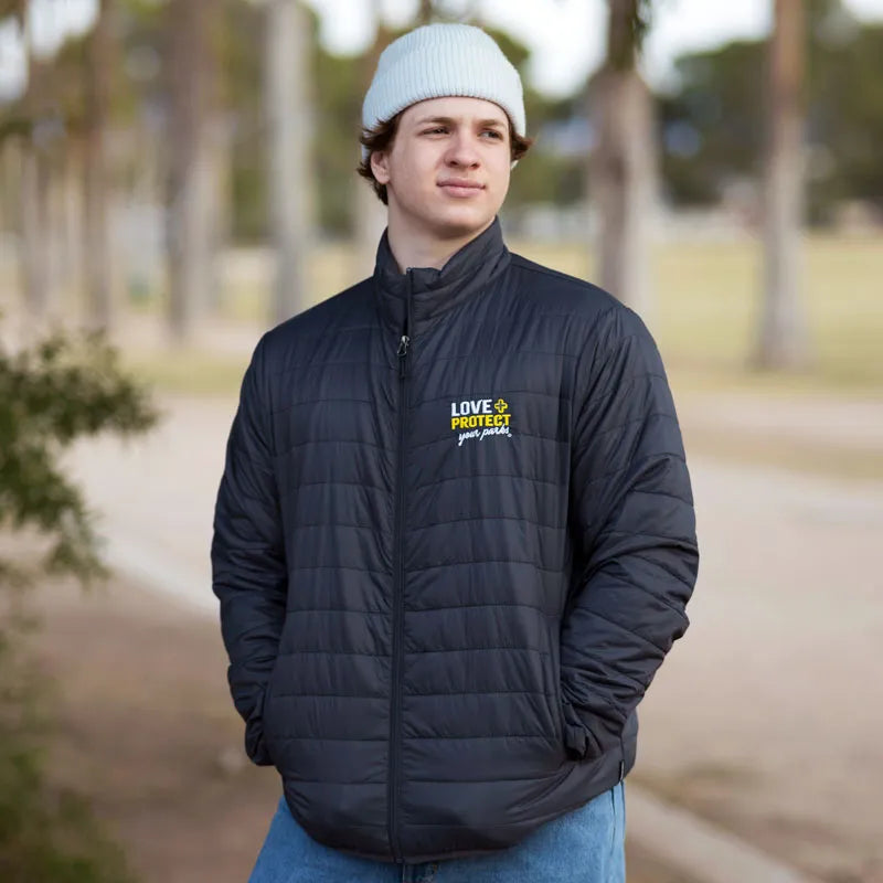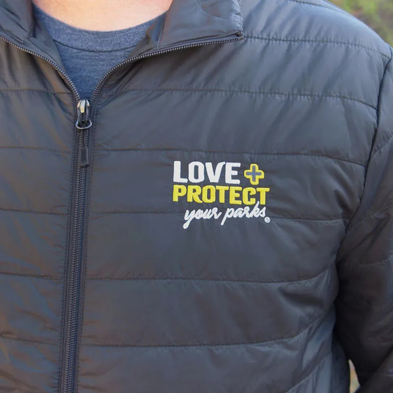 Travel ultra-light with our essential Love + Protect Your Parks packable puffer jacket. Polyloft® insulation shields mightily against heavy wind chill in a tiny package. It's the perfect stowable jacket for all travelers experiencing those times when a mild day turns into a chilly night. The included carrying pouch makes it easy to stow in your daypack so you're prepared no matter the weather. Plus, you'll look stylish as you display your love and support for parks for all the world to see.