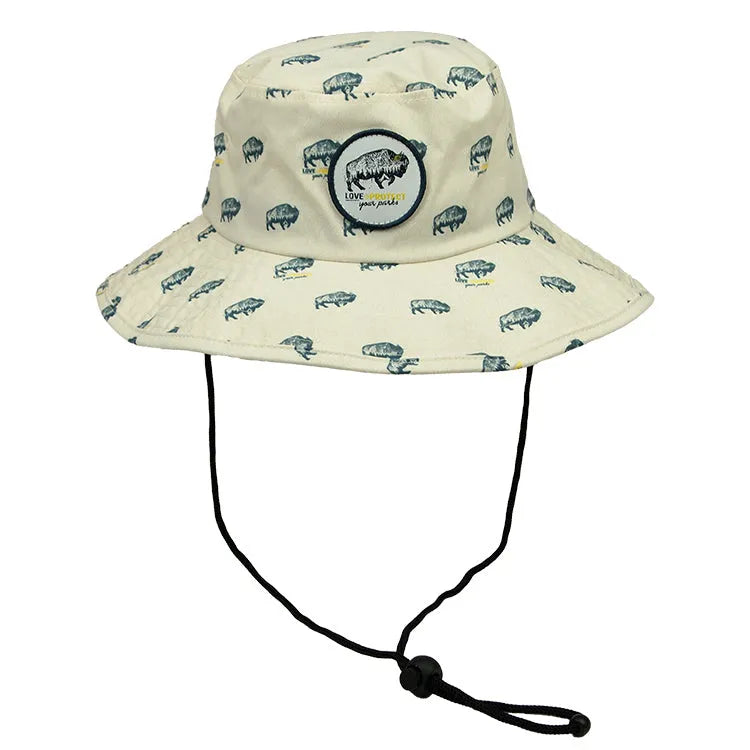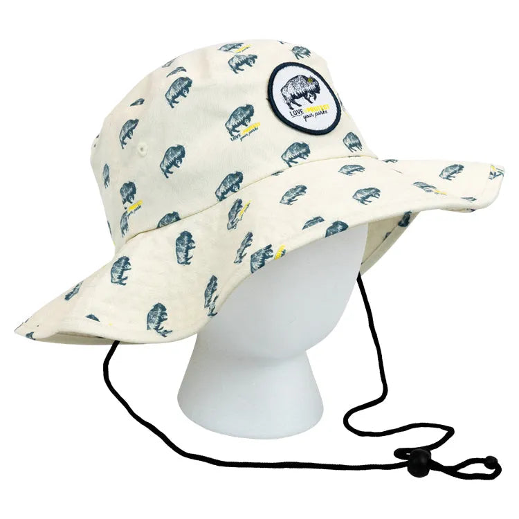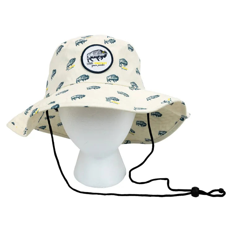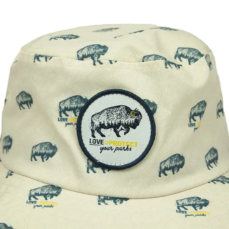 Introducing our 100% moisture wicking polyester bucket hat featuring WNPA's exclusive Love + Protect Your Parks logo. This stylish hat includes a vibrant patch and full coverage printing of the iconic logo on a topographical map. Designed for comfort and durability, it features an adjustable strap to keep it secure even in high winds. Perfect for outdoor enthusiasts and park supporters, this bucket hat combines functionality and a passion for nature, making it an essential accessory for any adventure.