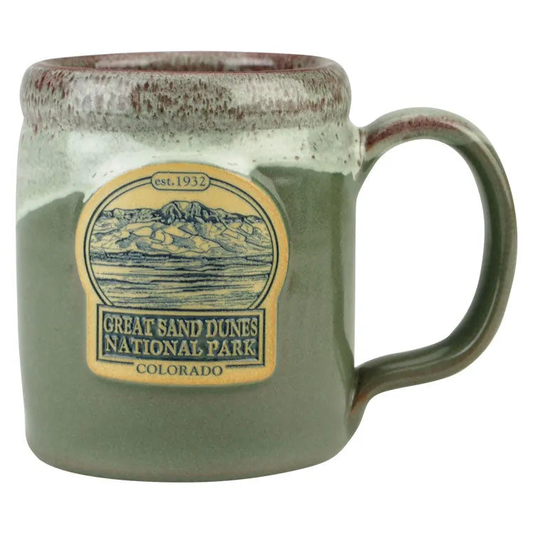 We've teamed up with legendary ceramics company Deneen Pottery to create a series of commemorative mugs honoring our partner parks throughout the West. Each mug has a custom ceramic badge and is painted and glazed in colors chosen by the park. This mug for Great Sand Dunes National Park features the park's massive sand dunes, which are the tallest sand dunes in North America.