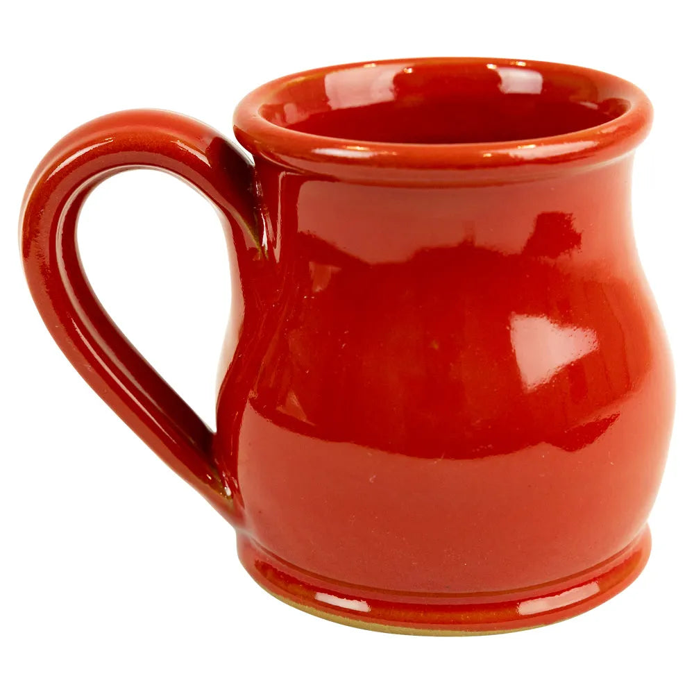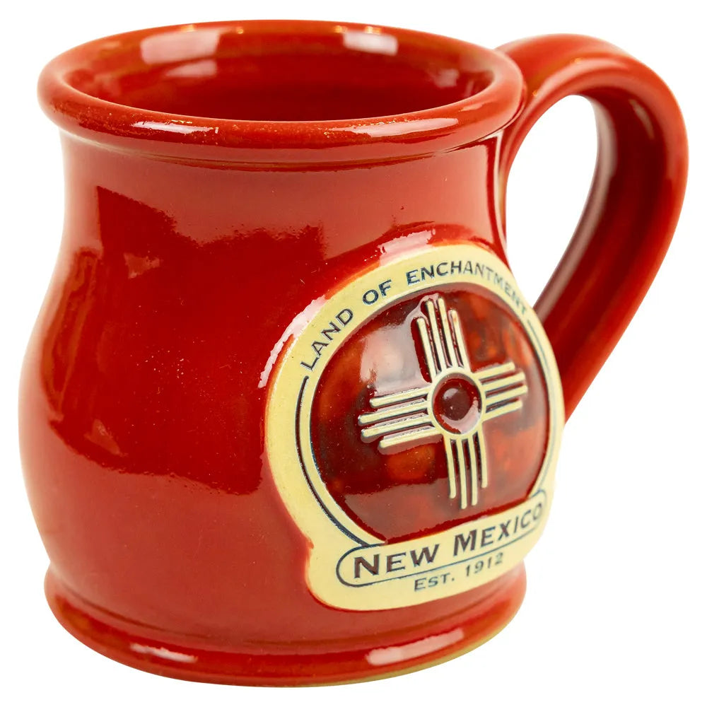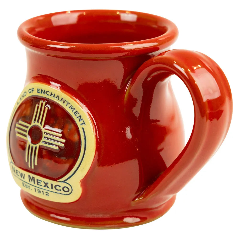 This round belly design features a bold red glaze with a medallion of the Zia sun symbol, representing the state’s cultural heritage and natural beauty. Its rounded shape makes it comfortable to hold, while the durable stoneware construction ensures it will last for years.