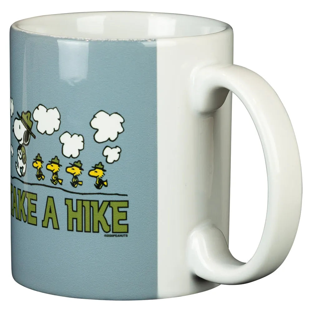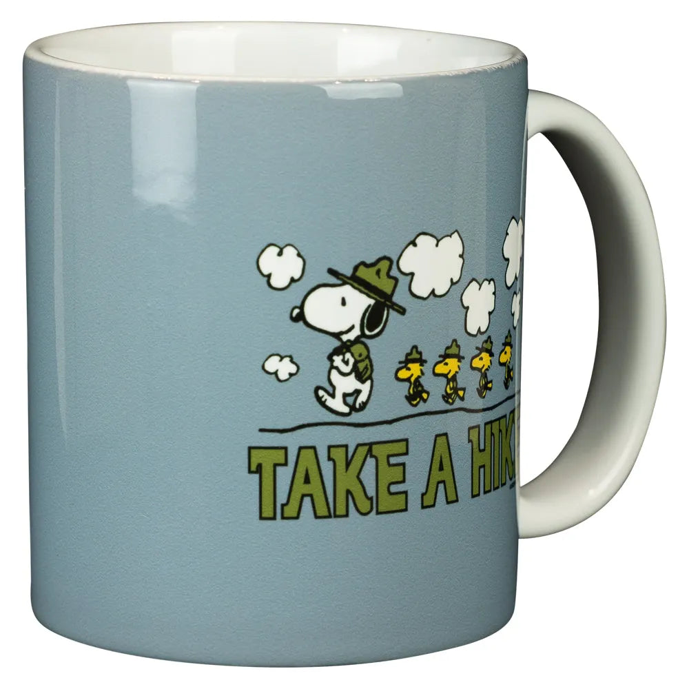 Mug featuring Peanuts characters Snoopy and Woodstock with 'Take a Hike' text in written in green on a light blue background