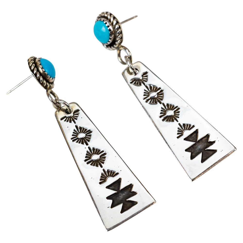 The Kingman turquoise, prized for its vivid blues, is the centerpiece of these earrings, contrasting beautifully with the polished silver. The overlay technique adds depth, while the stamped motifs nod to time-honored designs. Lightweight and versatile, the earrings carry both elegance and cultural meaning.