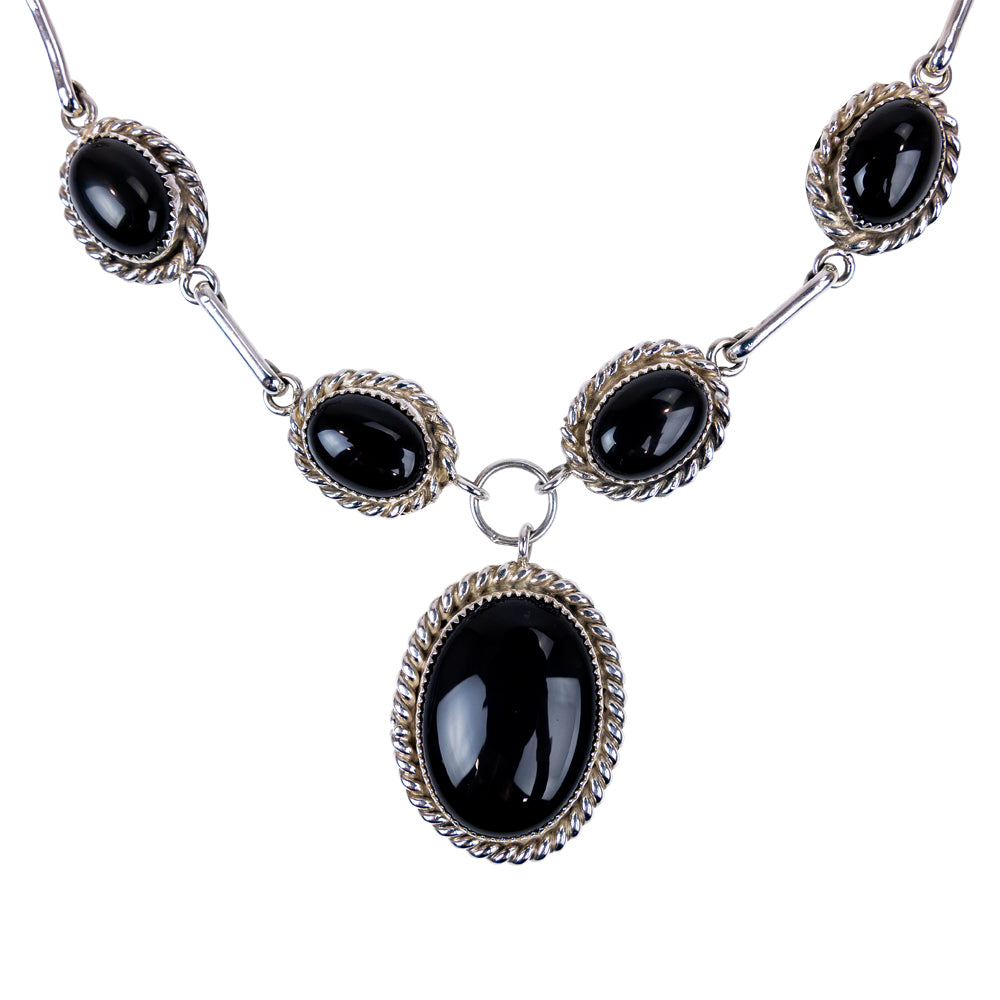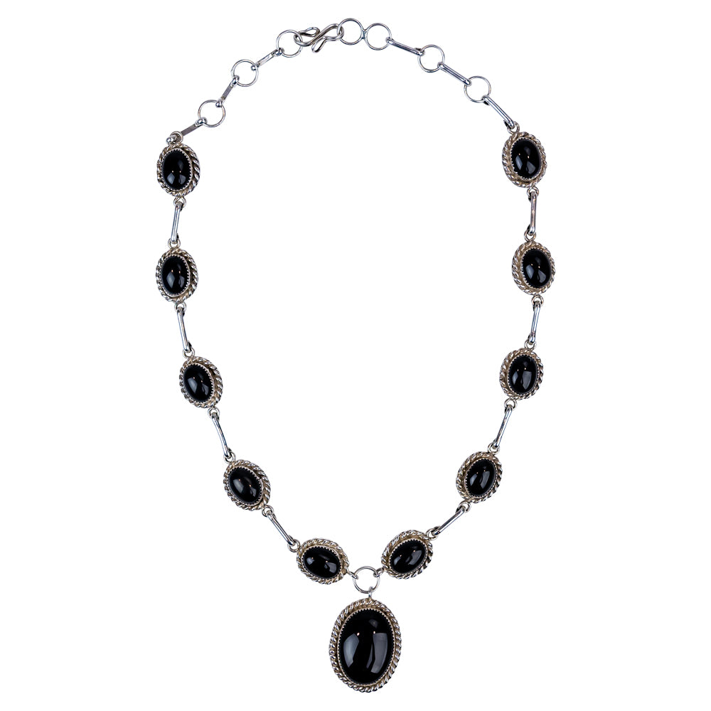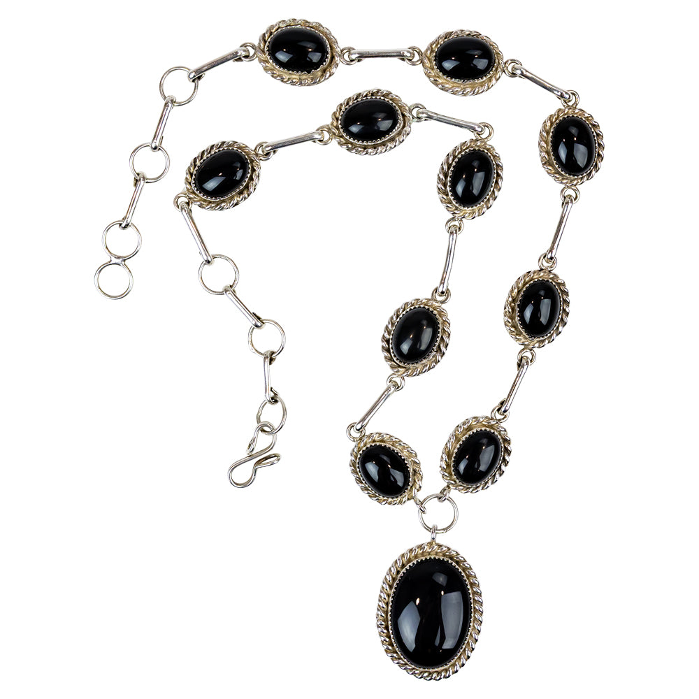 This striking onyx cluster pendant necklace is handcrafted by Santo Domingo artist John Aguilar, whose deep connection to jewelry-making began in childhood. Measuring 20 inches long with a bold pendant, the piece features polished black onyx stones framed in sterling silver. Rope accents highlight the natural beauty of each stone, creating a piece that is as versatile as it is elegant.