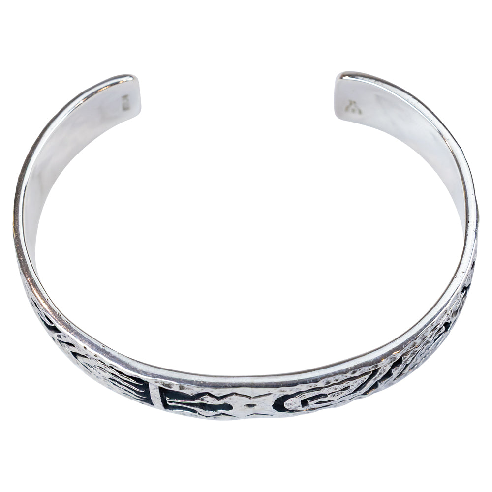 This handcrafted sterling silver bracelet is the work of Hopi artist Ruben Saufkie from Shungopavi on Second Mesa, Arizona. It carries a design of corn and clouds, symbols tied to growth, nourishment, and blessings. Ruben is known for his mastery of Hopi overlay, a technique where designs are cut from one sheet of silver and soldered onto another, creating striking depth and texture. He also brings in the tufa casting method, an ancient process using hand-carved molds made from volcanic tufa stone. This blending of traditions results in jewelry that is both timeless and innovative.