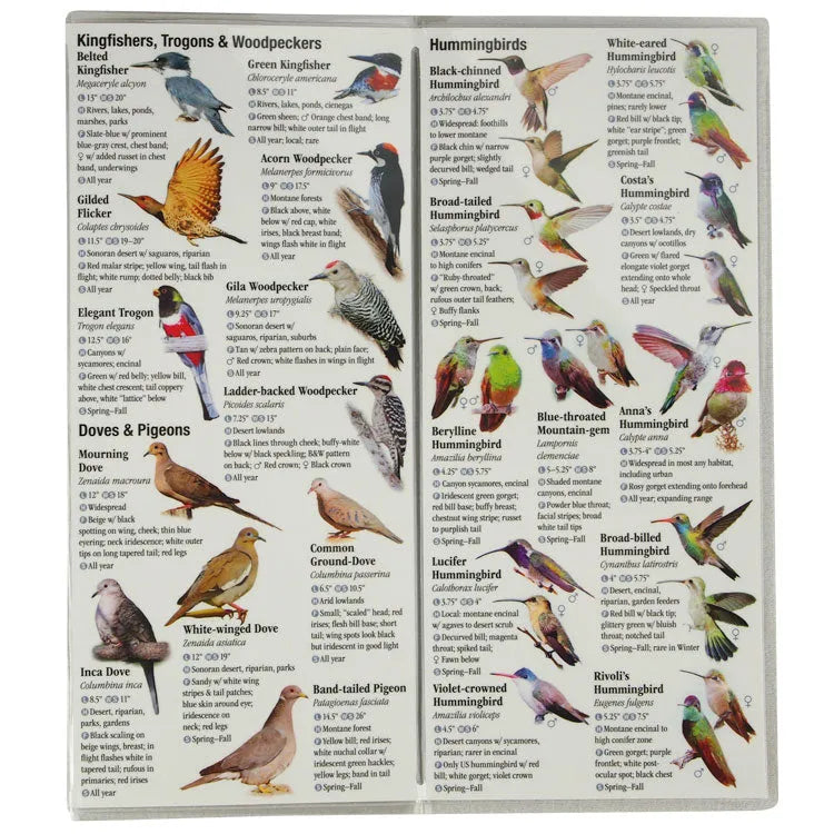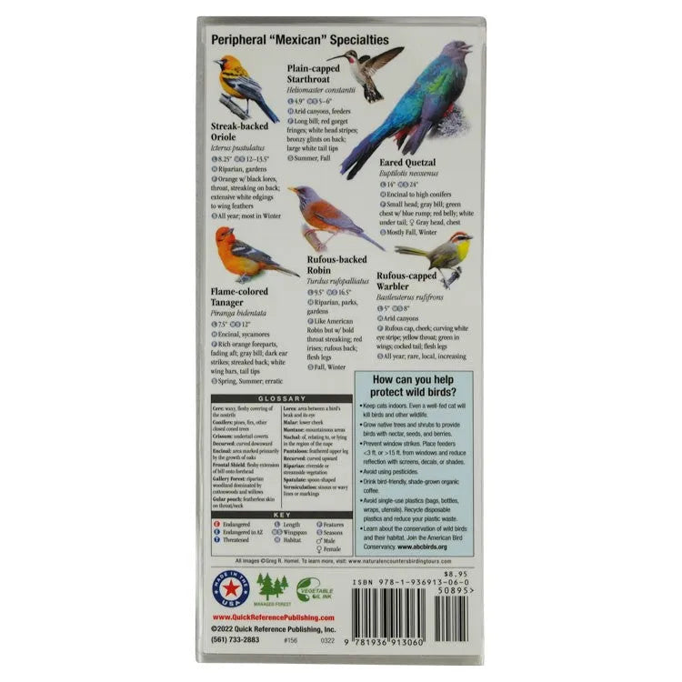 Birds of Southeast Arizona is an easy-to-use, light-weight, durable, all-weather field guide to the incredibly varied birdlife of perhaps the best inland birding area in the United States: Southeastern Arizona. This area includes the saguaro- and ocotillo-clad Sonoran and Chihuahuan deserts, rugged canyons, lofty pines, oak-studded “sky islands,” the riparian San Pedro River and grassy Sulphur Springs valleys!