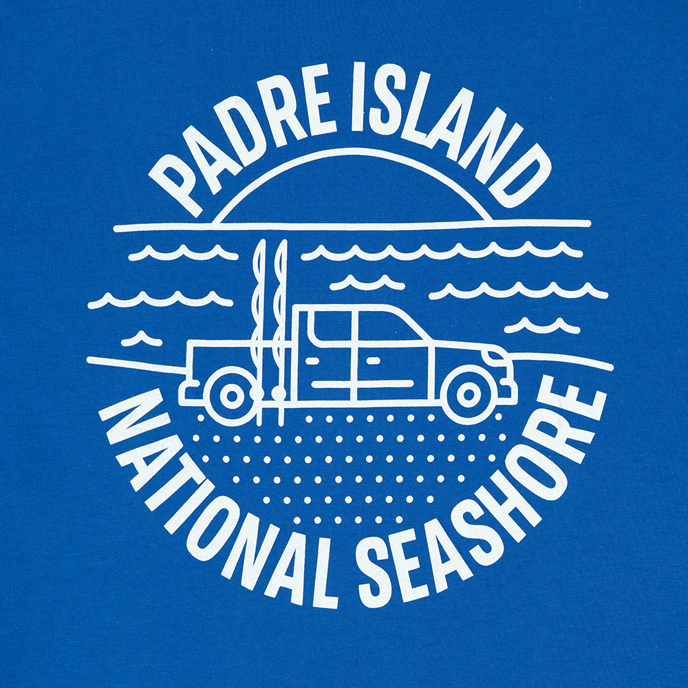 Blue t-shirt with 'Padre Island National Seashore' graphic on a white background