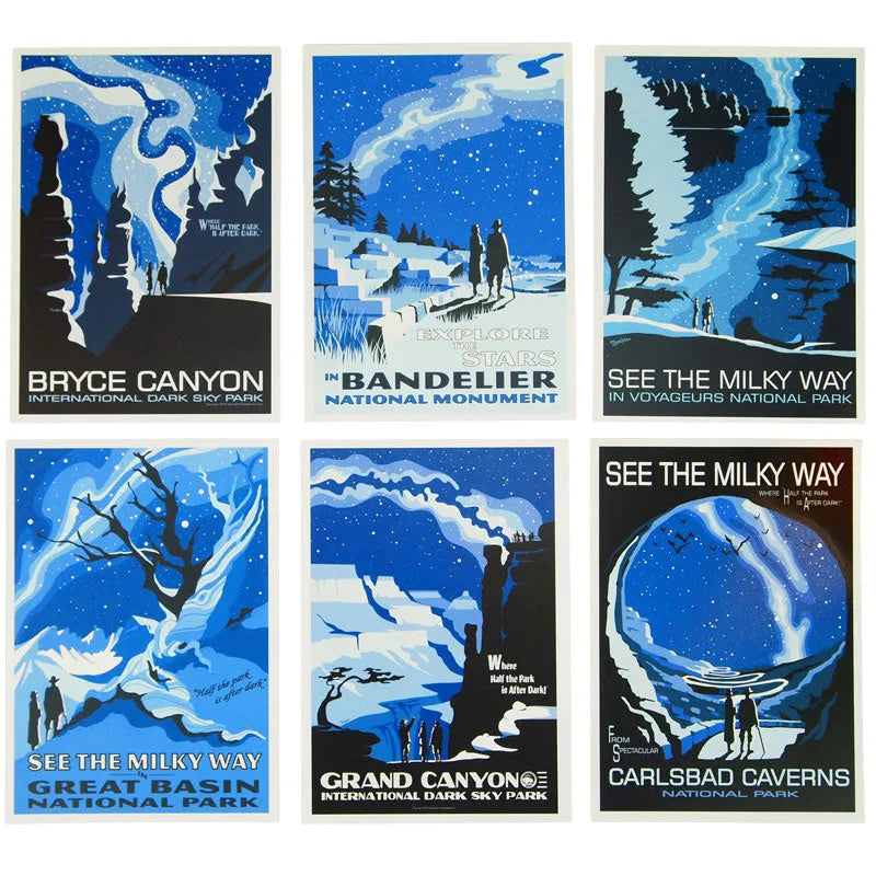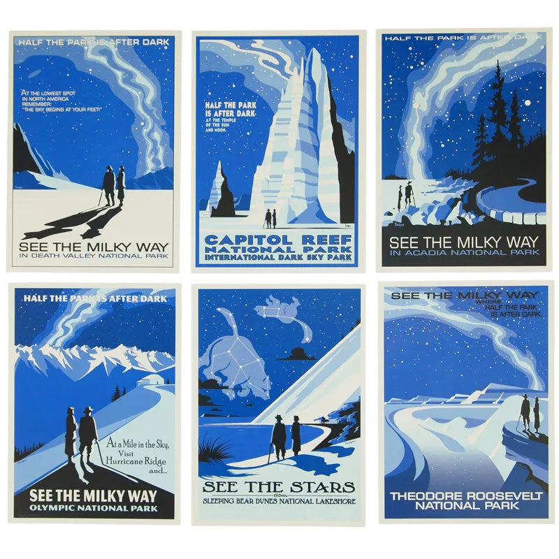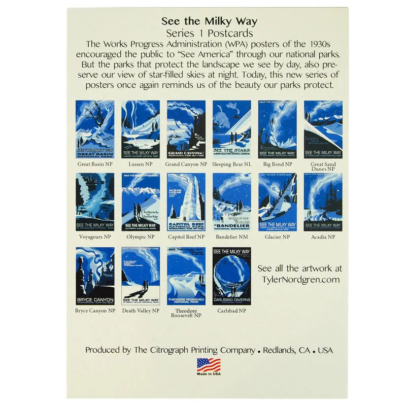 Capture the beauty of the night sky with our night sky national parks postcard set. This vintage-style artwork was created by illustrator and astronomer Tyler Nordgren in the style of his 2007 Half the Park is After Dark poster campaign, which aimed to educate people about light pollution and encourage them to look up and notice the Milky Way. This set includes 16 postcards, showcasing the constellations and nighttime views over various national parks. Whether you're an avid traveler, an art enthusiast, or an astronomy lover, this set is a visual treat and a perfect way to share the magic of the night sky with others.