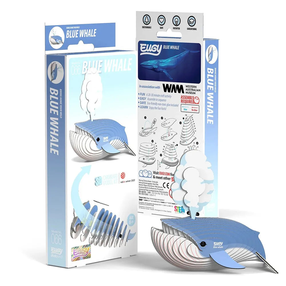 3D cardboard puzzle of a blue whale with EUGY branding on a white background