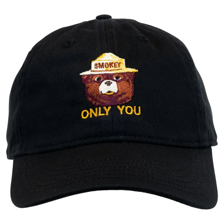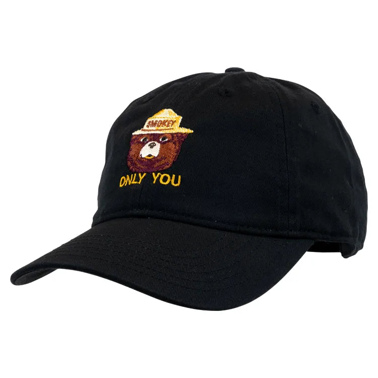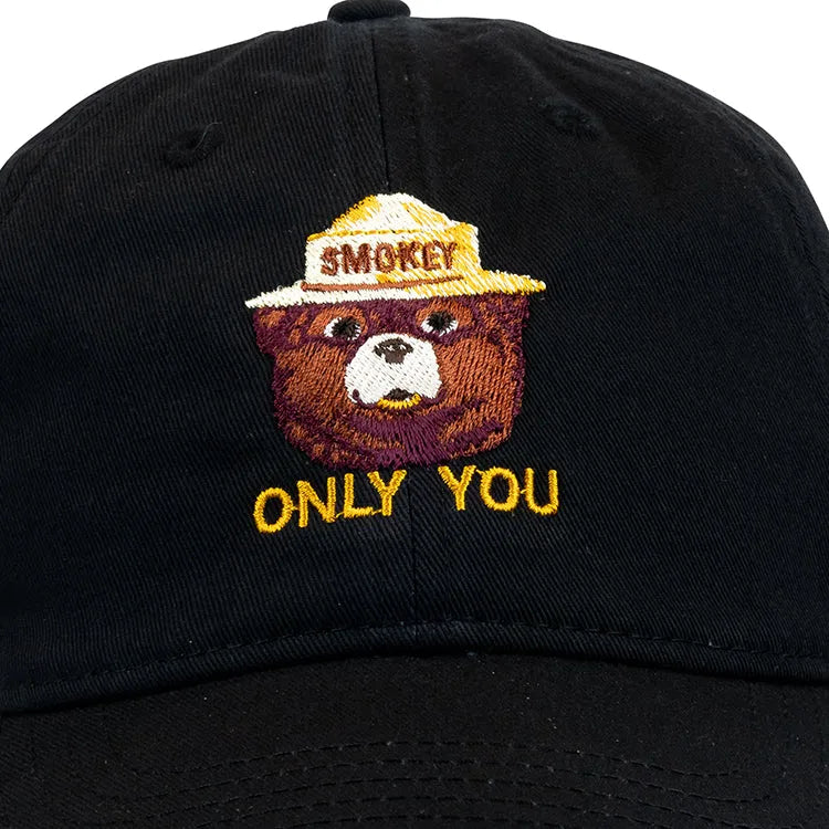Get ready to channel timeless style and conservation awareness with our 100% cotton black ball cap, featuring an intricately embroidered image of Smokey Bear and his iconic 'Only You' message. Crafted with premium quality cotton, this cap offers both comfort and durability for everyday wear. Make a statement while advocating for forest fire prevention wherever you go. Embrace classic Americana and environmental stewardship with this must-have accessory. Shop now and join the Smokey Bear legacy!