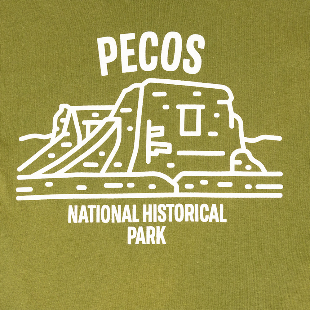 Green t-shirt with white outline of Pecos National Historical Park design on a green background