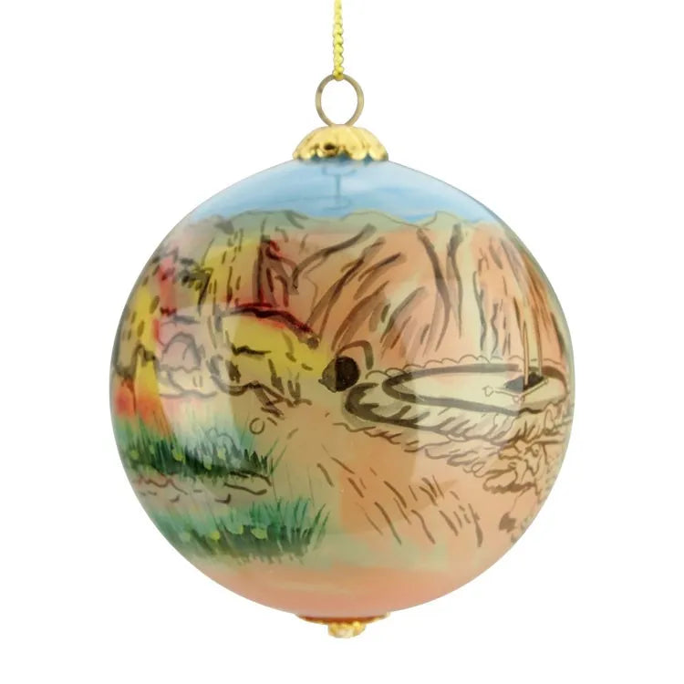 Remember your national park adventures every holiday season with our bolihua ornaments! Bolihua is a reverse glass painting technique practiced in China since the early 1700s. The painted image is applied by hand to the inside of a glass bulb through holes at the top and bottom using special narrow brushes and pointed sticks. The design detail is applied in layers over several days, so each ornament is absolutely unique. This one features imagery inspired by the ancient ruins protected at Bandelier National Monument along with its iconic entrance sign.