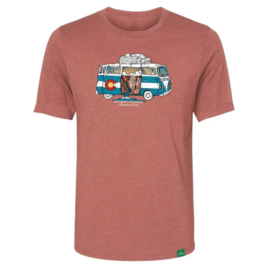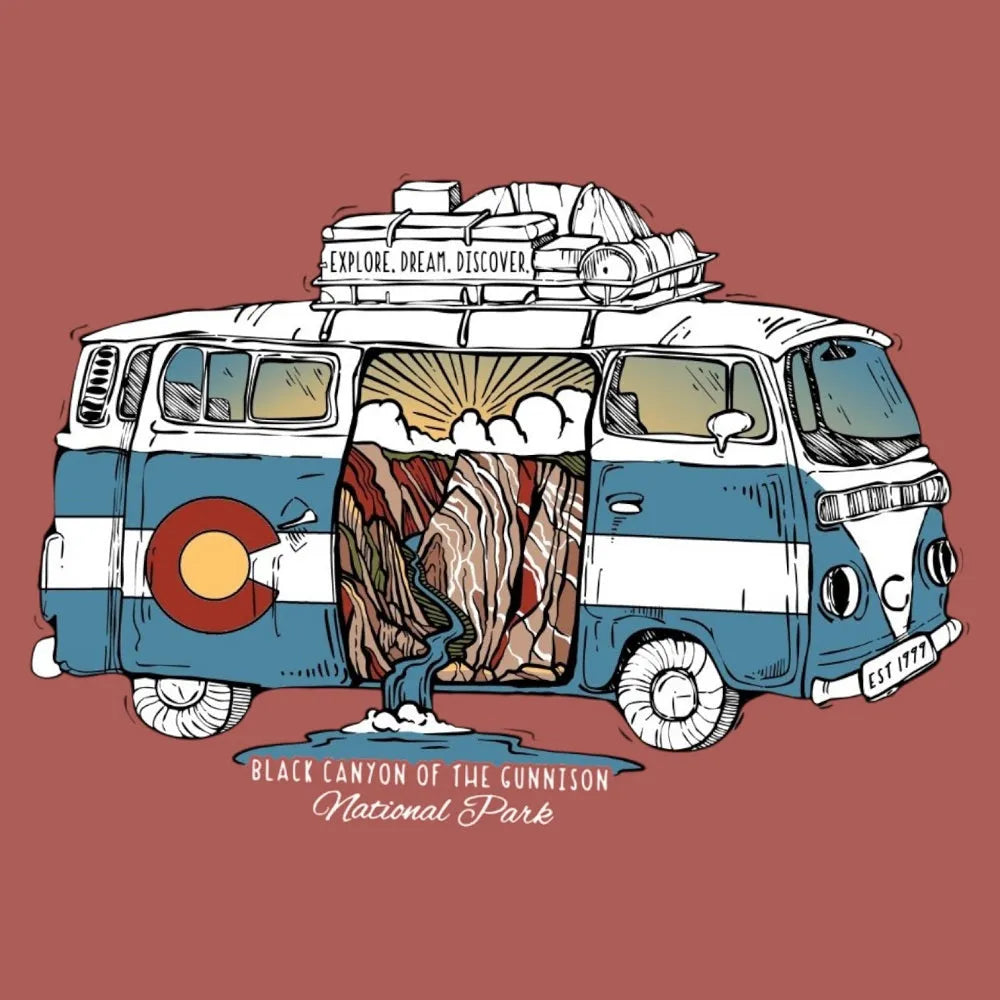 Show your love for epic landscapes with our Black Canyon of the Gunnison National Park T-Shirt. This van tour design features a vintage RV parked with its doors open to reveal the canyon’s steep walls and the Gunnison River flowing through—and right out of—the van door. A nod to Colorado pride, the RV sports the iconic state “C” on its door.