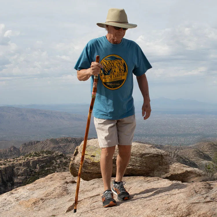 Hiking sticks are really cool, and helpful on hikes, but boy are they unwieldy! Well we've solved that problem. Check out our new collapsible hiking sticks. Unscrew the pieces and it breaks down to a manageable 16" or 18 1/2" per piece for the 48" and 55" sticks respectively. And speaking of screws, the commercial grade connectors are sturdy enough to handle the huskiest of hikers. You can also use these convenient hiking sticks to display your park related hiking stick medallions, in a fully transportable way. How cool is that?