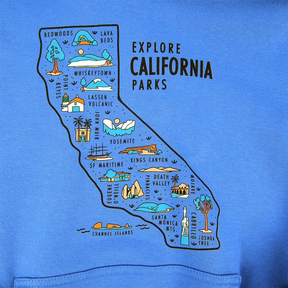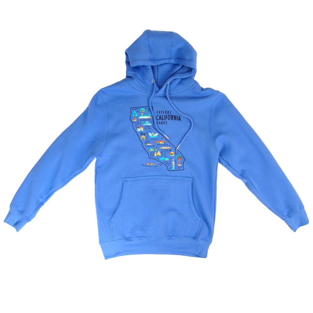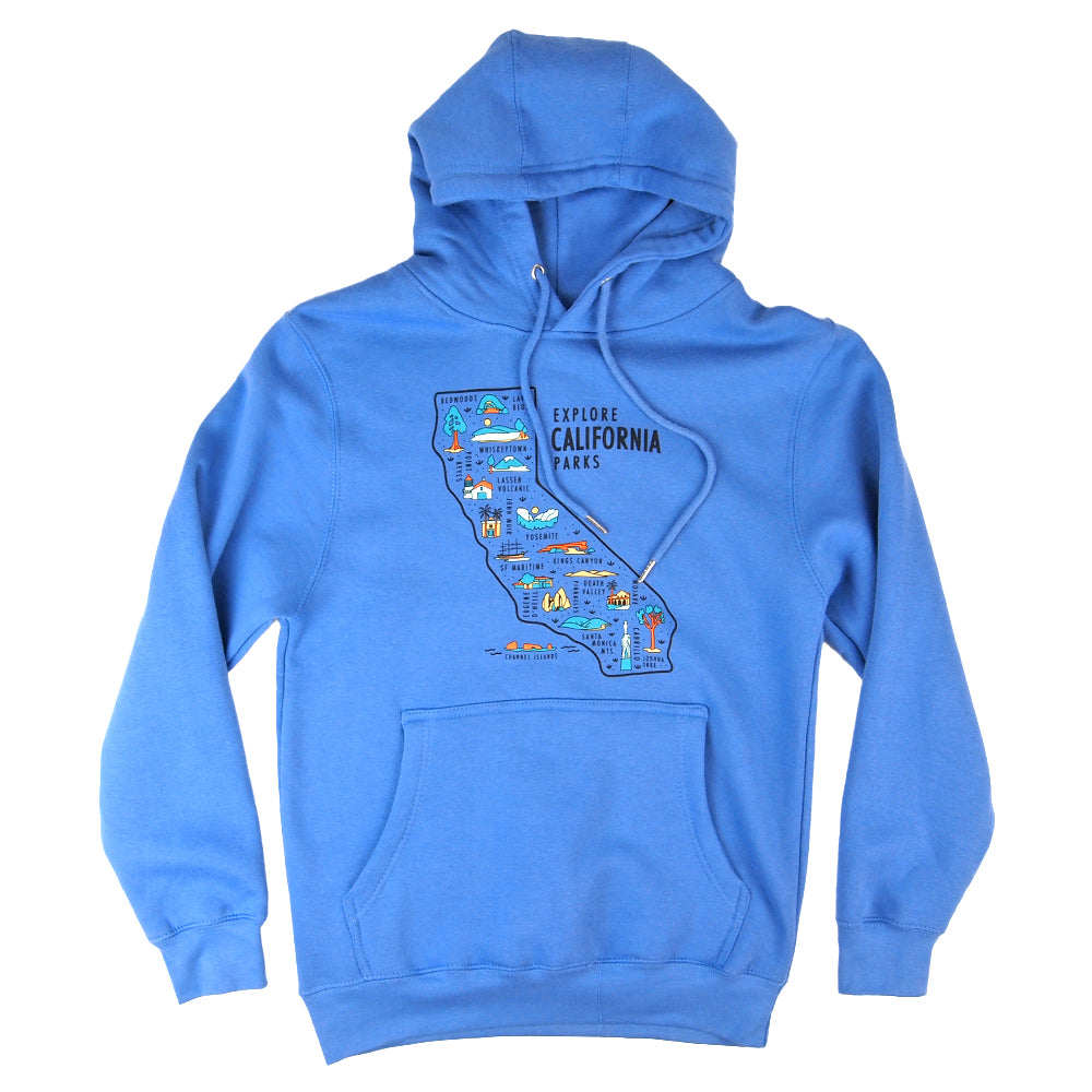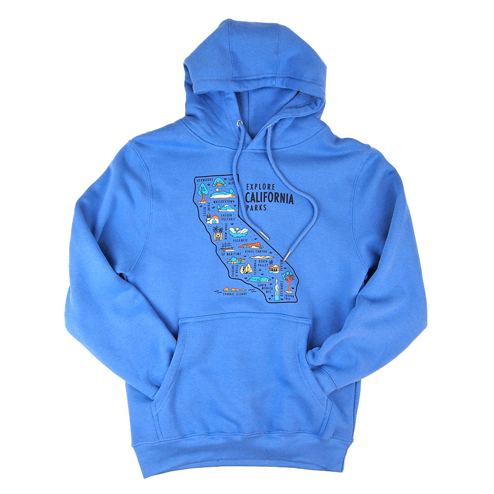 Show your love for the wild beauty of the Golden State with the Explore California parks hoodie. This cornflower blue sweatshirt hoodie features a California map with modern logo-style illustrations of the state's iconic national park sites.
