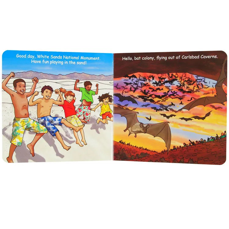 Good Night New Mexico explores Albuquerque, Las Cruces, Silver City, Taos, Santa Fe, Carlsbad Caverns, White Sands National Monument, the Gila Cliff Dwellings, the International UFO Museum Research Center, hot air ballooning, and more. Jump into your hot air balloon and let's explore the great state of New Mexico. Little ones will discover all the unique sights and attractions this lovely region has to offer.