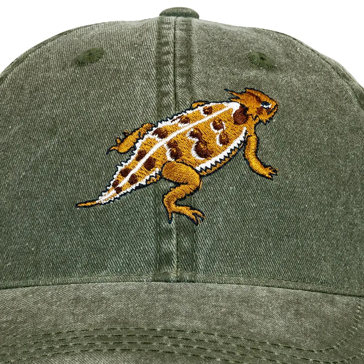 Show off your love for the official state reptile of Texas with our horned toad cotton ball cap. The front of this hat features a finely embroidered horned toad, a unique lizard known for their spiky appearance. Crafted from premium 100% cotton, this comfortable hat is a great everyday accessory for nature and lizard lovers alike.