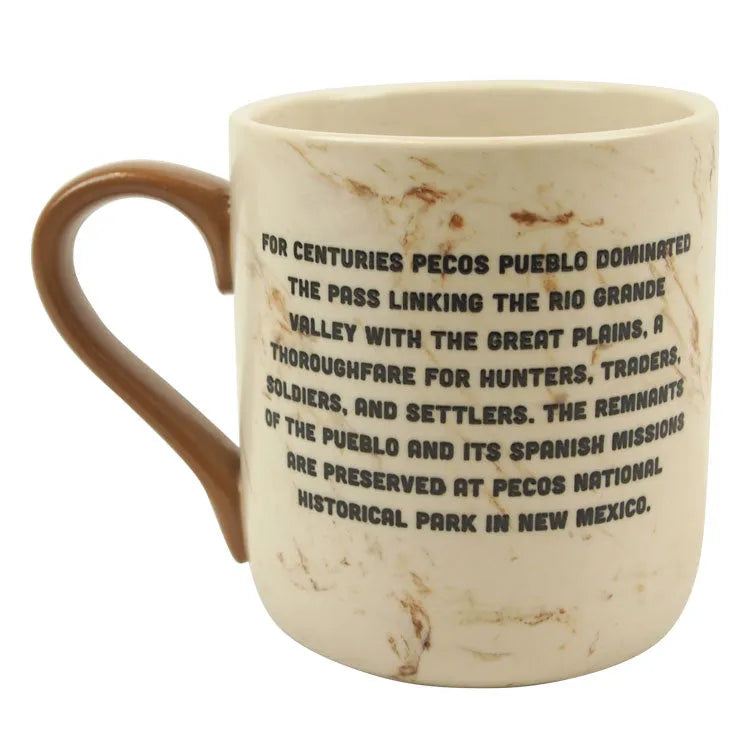 Toast your public lands with this custom marbled ceramic national park mug representing Pecos National Historical Park. One side depicts an example of American Indian pottery as may have been crafted by the Pueblo people or their ancestors. The other side offers a brief description of the area and what makes it special.
